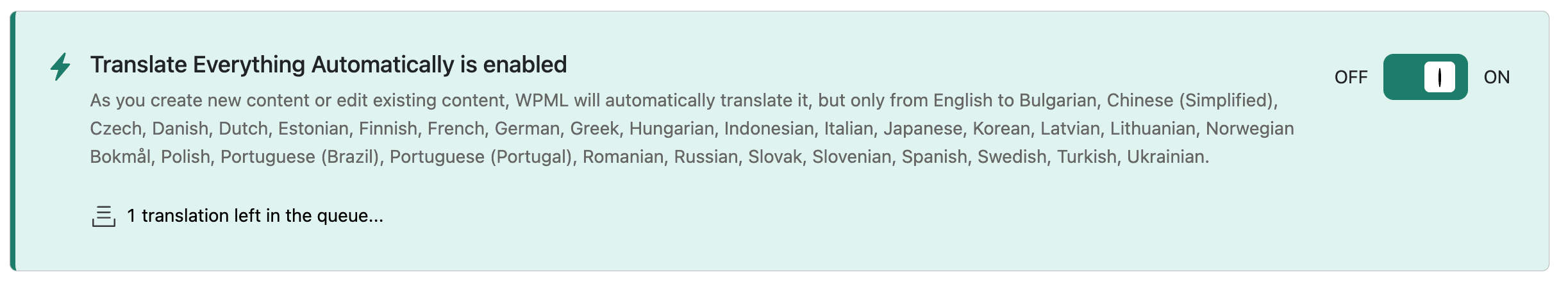 Die automatische Übersetzung wird über WPML → Einstellungen → Automatische Übersetzung aktiviert und erfordert Übersetzungsguthaben. Die Credits werden pro Wort berechnet, und die Anzahl der benötigten Credits hängt von der von Ihnen gewählten Übersetzungsmaschine ab. Die Credit-Zuteilung ist je nach Tarifstufe im Jahr 2026 unterschiedlich: etwa 90.000 Credits im CMS-Tarif und 180.000 Credits im Agentur-Tarif.