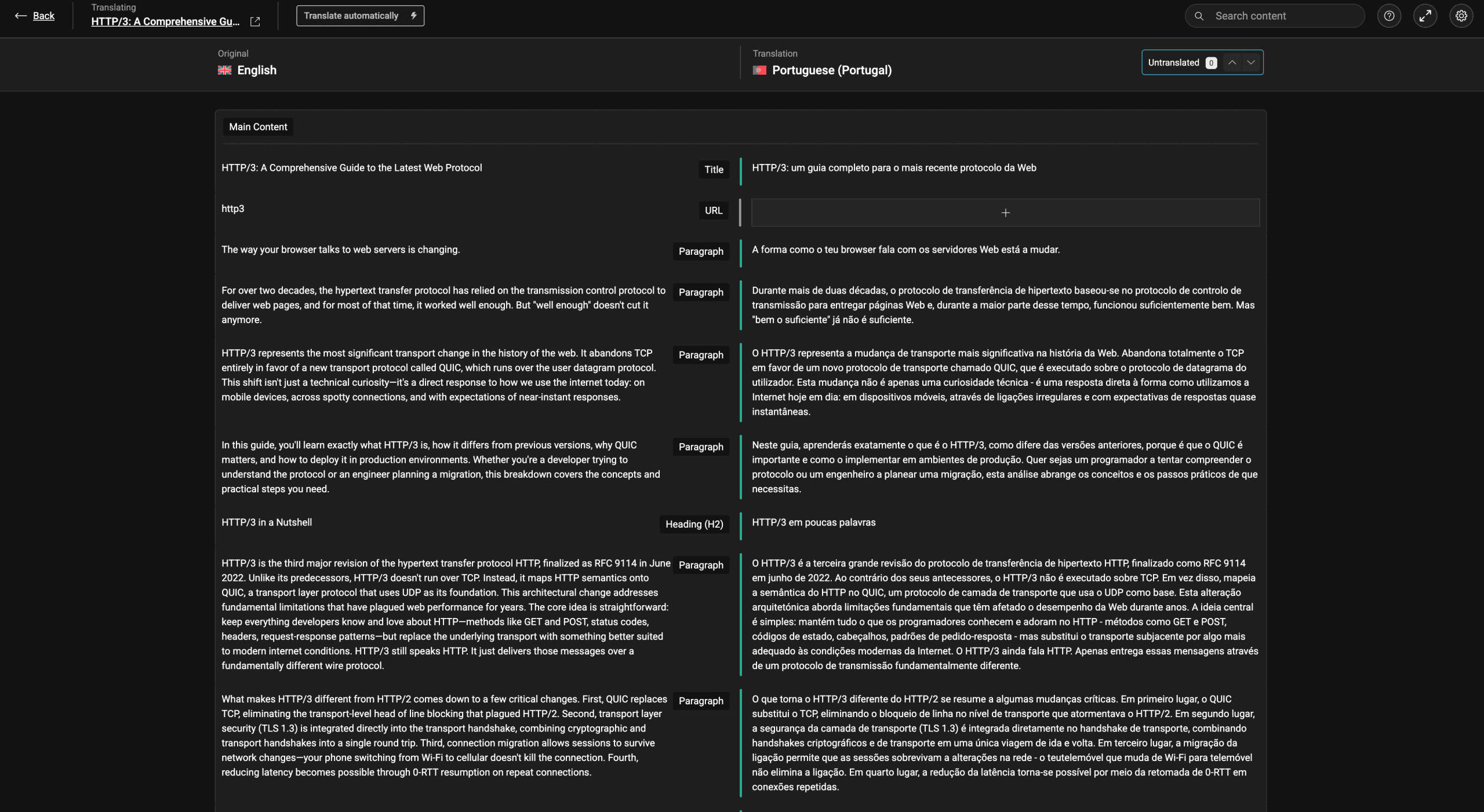 - Konfigurieren Sie die automatische Übersetzung für hochvolumige Inhalte wie Blogbeiträge und Produktbeschreibungen.